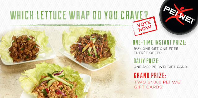 “Vote for the Pei Wei lettuce wraps you crave most – Traditional Chicken, Thai Chicken, or Korean Steak – and receive a BOGO entrée offer (one offer per facebook account) plus a chance to win other great prizes just for participating. One lucky winner each day will receive a $100 Pei Wei gift card and two lucky winners will receive a $1,000 Pei Wei gift card at the end of the voting period. Come back often, every day you vote is a chance to win a $100 Pei Wei gift card. Contest ends July 5.”