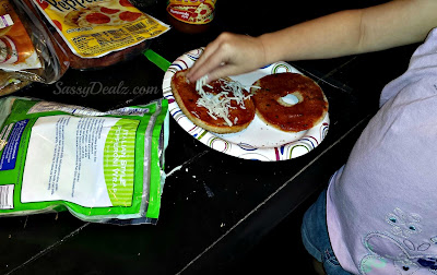 You will need Ragu pizza sauce, little pepperonis, shredded mozzarella cheese, and smart bagels (any whole wheat brand).