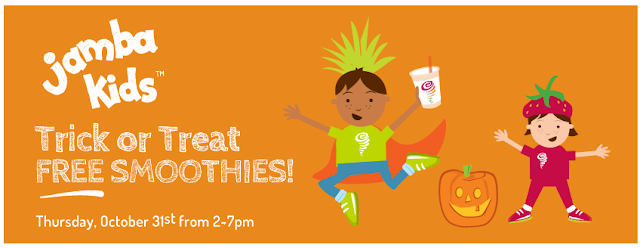 YAY! Take your kiddos to Jamba Juice tomorrow between 2-7PM to score them a free smoothie for Halloween! What a great freebie!